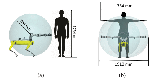 Orthrus平台的工作区与人类比较。(a)与人类的侧视图(b)。从前视图看系统的工作区。