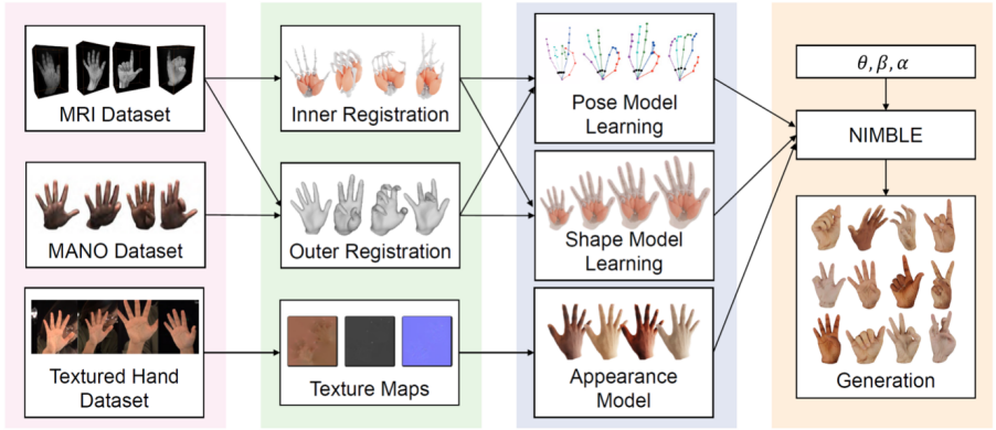 在参数学习的过程中,由于 MRI 数据的数量有限,研究者还借助了 [MANO] 模型的点云数据来扩充运动空间。通过在多个不同模态的数据集上迭代优化,之后构建出 NIMBLE 模型。与仅基于外表面的传统手部模型相比,NIMBLE 以数据驱动的方式实现了对手的内外部解剖结构统一建模。此外,模型还可以作为一个网络层应用于深度学习,以进行逼真虚拟手的生成和手势识别等多种任务。