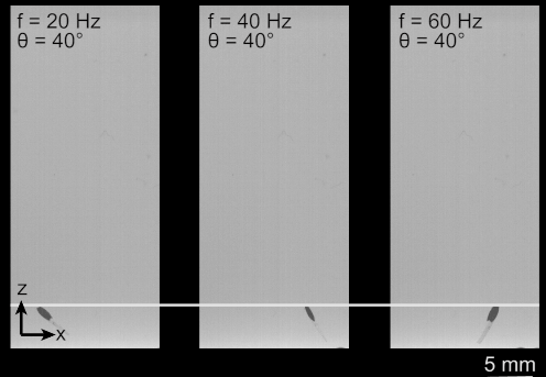 虽然足够小巧,但游泳能力不弱。研究人员通过施加不同振荡角和不同频率的磁场来控制它的运动。实验发现,例如当频率为60 Hz,振荡角为40°时,磁驱软体鱼可以达到30 cm/s的游泳速度。