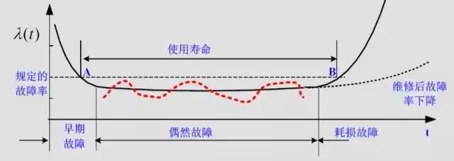 第一个规律就是曲线的第一段,在早期使用的时候,故障率非常高,要经过不断的维修、适应性的改进甚至修改设计、工艺,把故障率降下来;