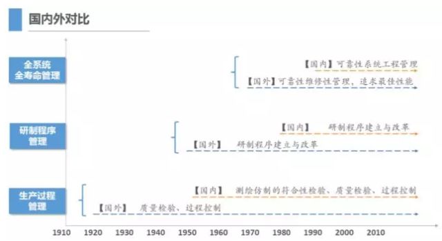 第二个对比是,国外二战期间和之后,制造过程的质量控制、质量检验做的很充分,在上个世纪50年代随着新的可靠性这些概念的出现,开始有了正向研发。美国军工行业在50年代开始建立采办程序,就是研发程序。中国以军品为代表的研发也是改革开放之后1982年才开始,有了武器装备研制程序。这个是一个非常有意义的历程。而非军工行业又比军工行业晚发展20年左右。